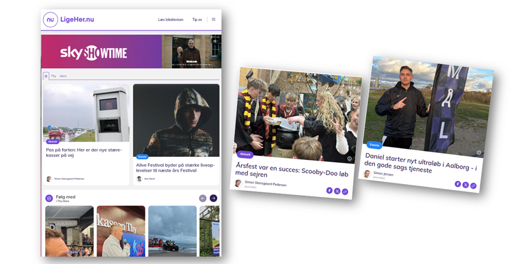 LigeHer.nu forbinder nordjyderne med nyheder, fællesskab og lokale muligheder. Vi skaber synlighed for lokale virksomheder og foreninger gennem engagerende journalistik og målrettede kanaler med flere end 200.000 følgere på sociale medier og 215.000 husstandsomdelte lokalaviser hver uge. På LigeHer.nu mødes de lokale stemmer, idéer og initiativer – og bliver til handling dér, hvor vi bor.